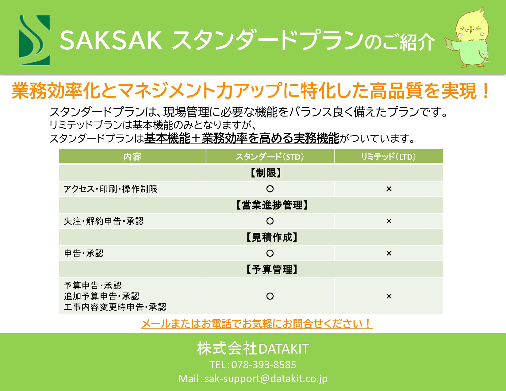 SAKSAKのスタンダードプランには、現場管理に役立つ“実務向けの機能”がしっかり入っています。